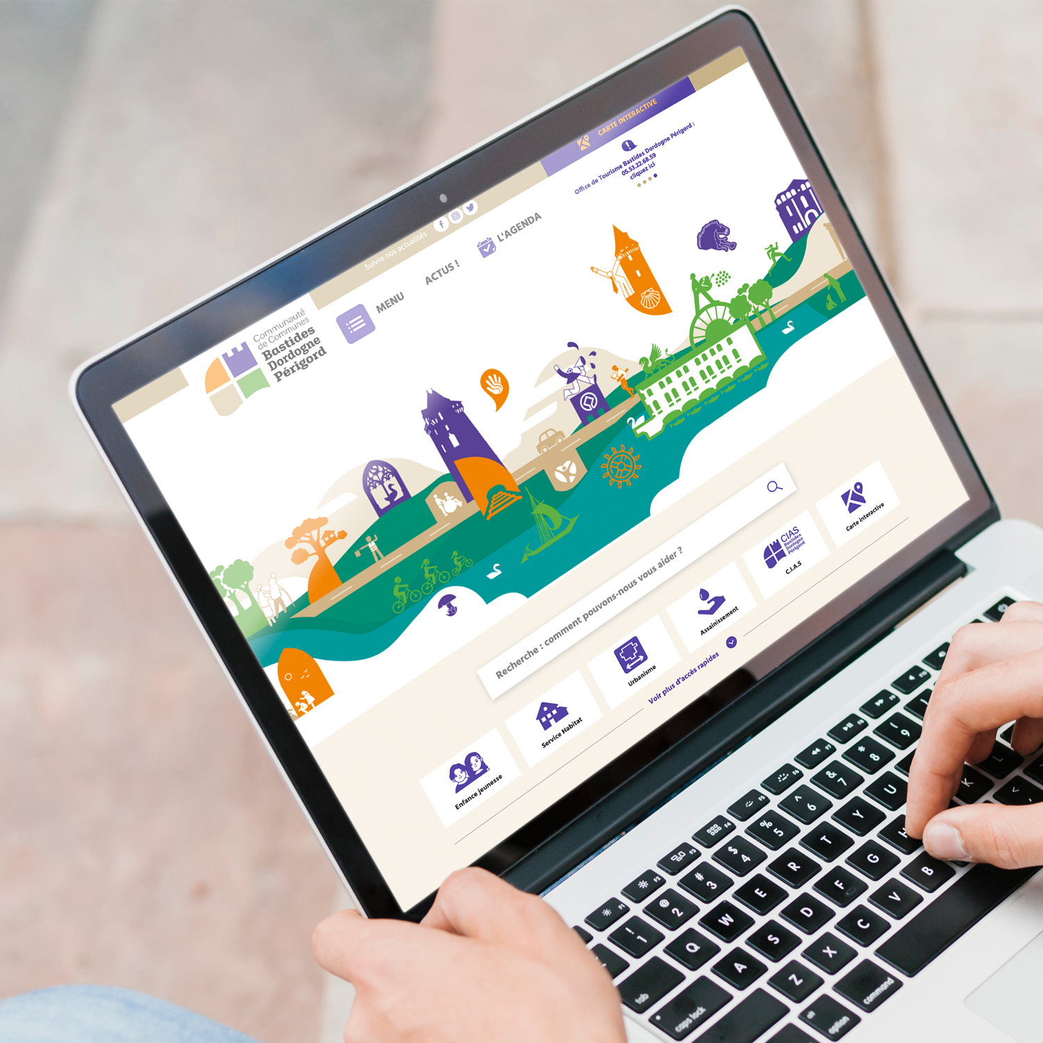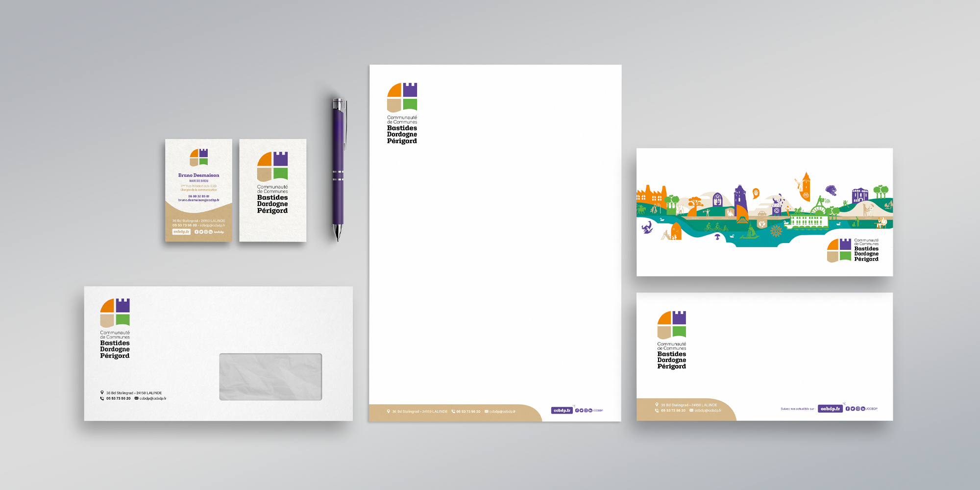 Quatre couleurs y sont associées, chacune portant une dimension du territoire : l’orange pour le rayonnement économique et touristique, le beige pour le cadre de vie et le terroir, le vert pour la nature et la rivière Dordogne, le violet pour le patrimoine médiéval et l’histoire. Une palette d’iconographies illustratives complète cet univers, créant ensemble un paysage symbolique du territoire déclinable sur l’ensemble des supports.