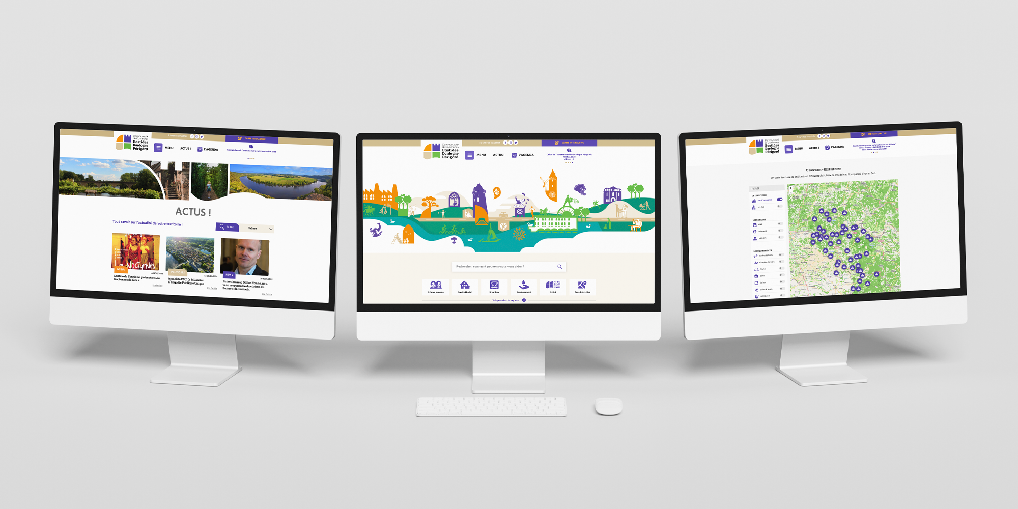 Quatre couleurs y sont associées, chacune portant une dimension du territoire : l’orange pour le rayonnement économique et touristique, le beige pour le cadre de vie et le terroir, le vert pour la nature et la rivière Dordogne, le violet pour le patrimoine médiéval et l’histoire. Une palette d’iconographies illustratives complète cet univers, créant ensemble un paysage symbolique du territoire déclinable sur l’ensemble des supports.