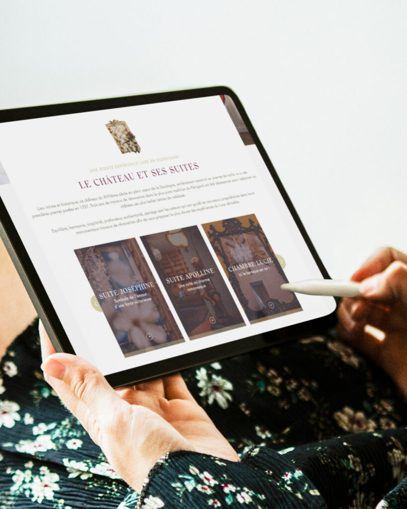 Laure Dupleix a conçu l’expérience web en miroir de l’expérience physique : immersive, aérée, progressive. La navigation accompagne le visiteur comme on lui ferait visiter le château — sans précipitation, en le laissant découvrir au rythme des pièces qui se révèlent. La mise en page laisse respirer les photographies, les blancs sont généreux, les interactions soignées — transitions douces, animations subtiles au scroll, effets hover délicats. Rien ne surcharge, tout enrichit. C’est le luxe au sens premier : l’espace, le temps, le soin.
