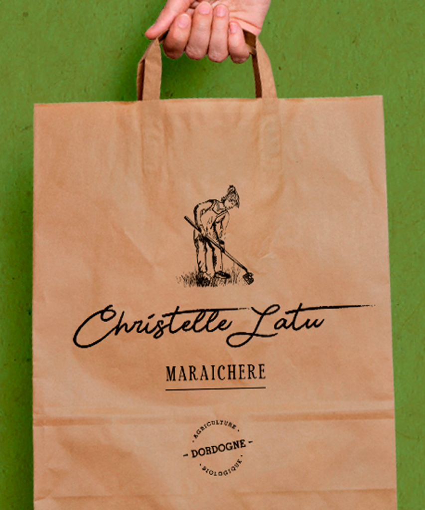 Christelle voulait quelque chose de vrai. Pas un logo abstrait, pas une identité aseptisée — quelque chose qui la représente, elle, à l’ouvrage. Le logotype dessiné pour elle la montre les pieds dans son champ : une silhouette de maraîchère fière et ancrée, qui dit en un coup d’œil ce que sont les Paniers Bio de Christelle. Un travail manuel, honnête, lié au cycle de la nature. Un univers brut, dans la matière comme dans le geste.