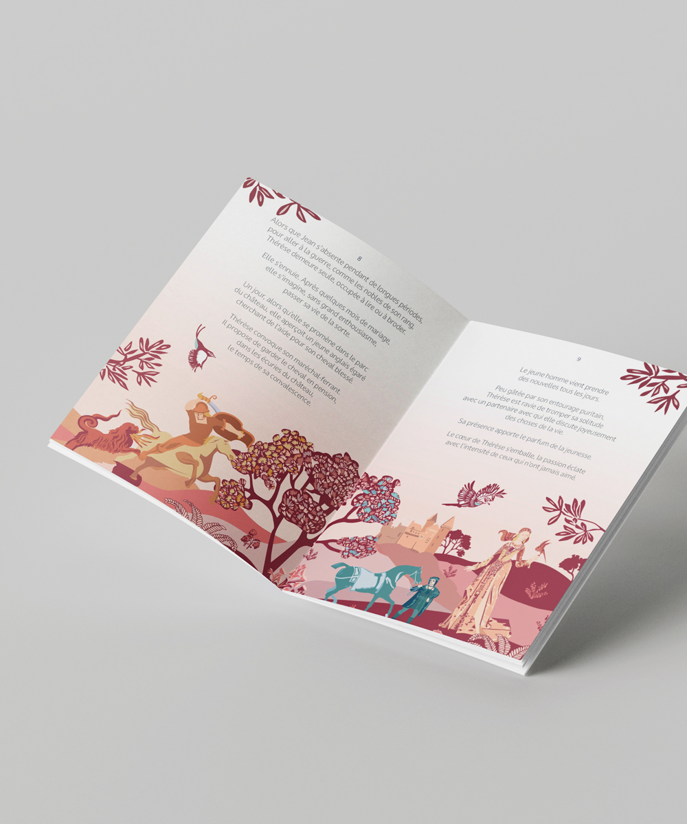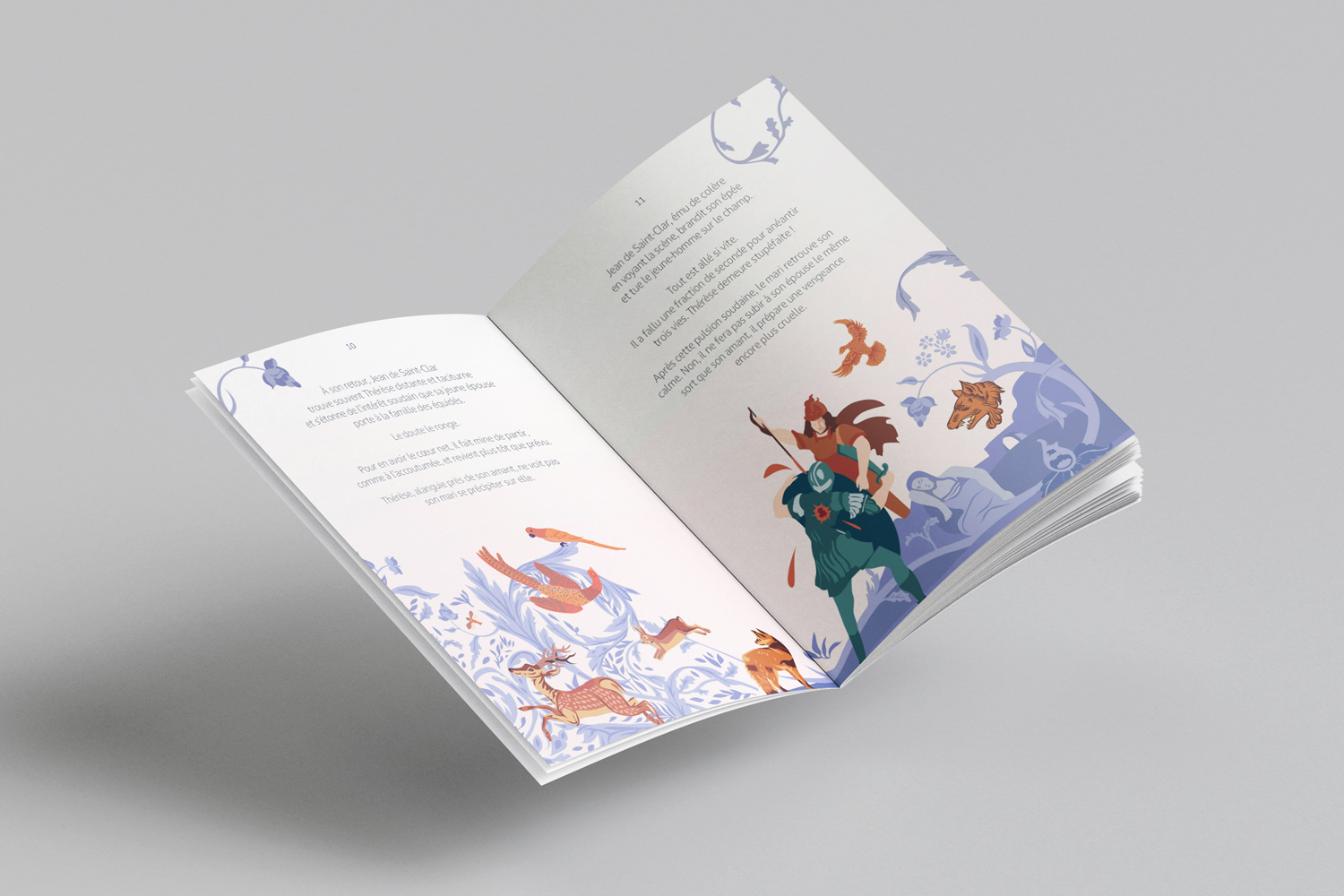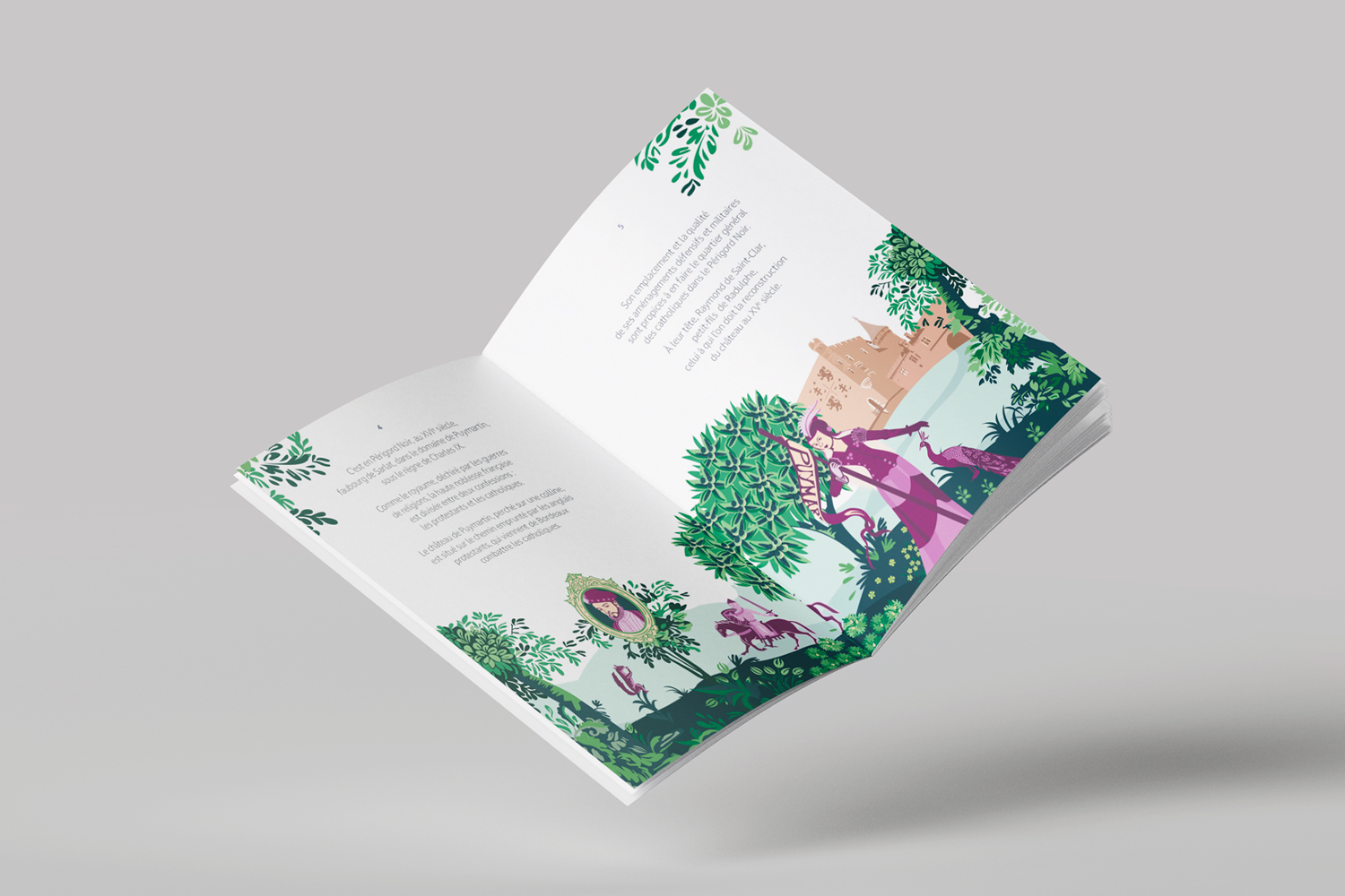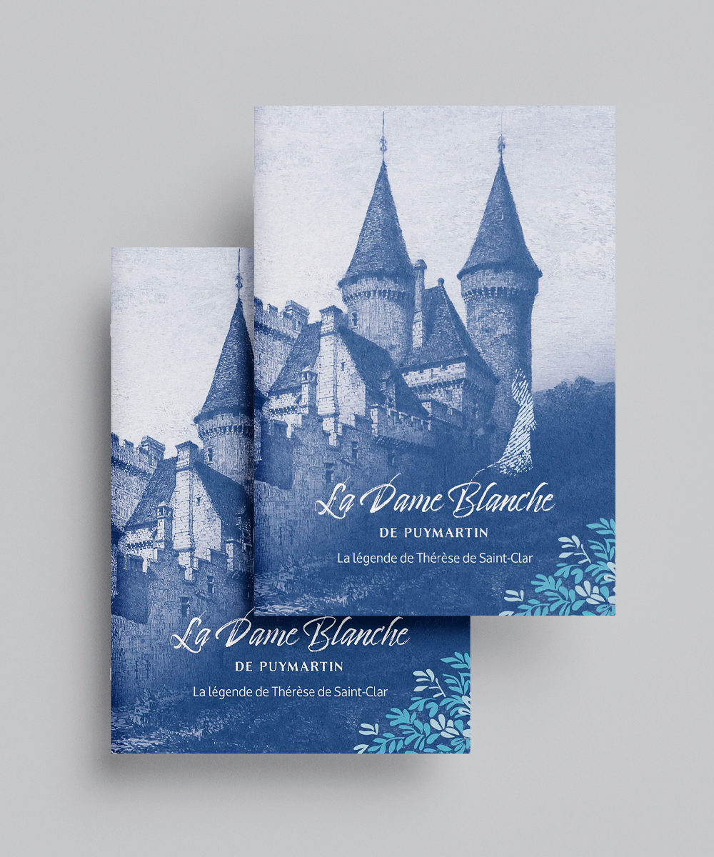 Cette identité a trouvé sa première expression dans un livret de 24 pages, édité en français et en anglais, qui retrace la légende à travers cinq illustrations originales. Conçues comme des apparitions — jouant sur l’évanescence, les silhouettes fragmentées, les zones d’ombre — elles ne cherchent jamais à démontrer, elles évoquent, elles nourrissent le mystère. Ce livret participe à la médiation culturelle auprès de tous les publics, il prolonge l’expérience de visite au-delà du château.